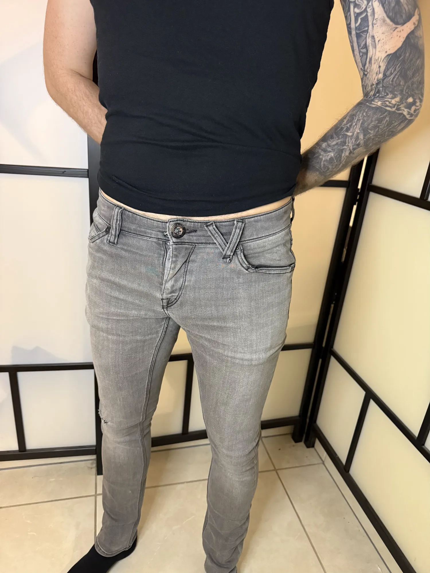 Details: Button & zip closure, five pockets, slim cut