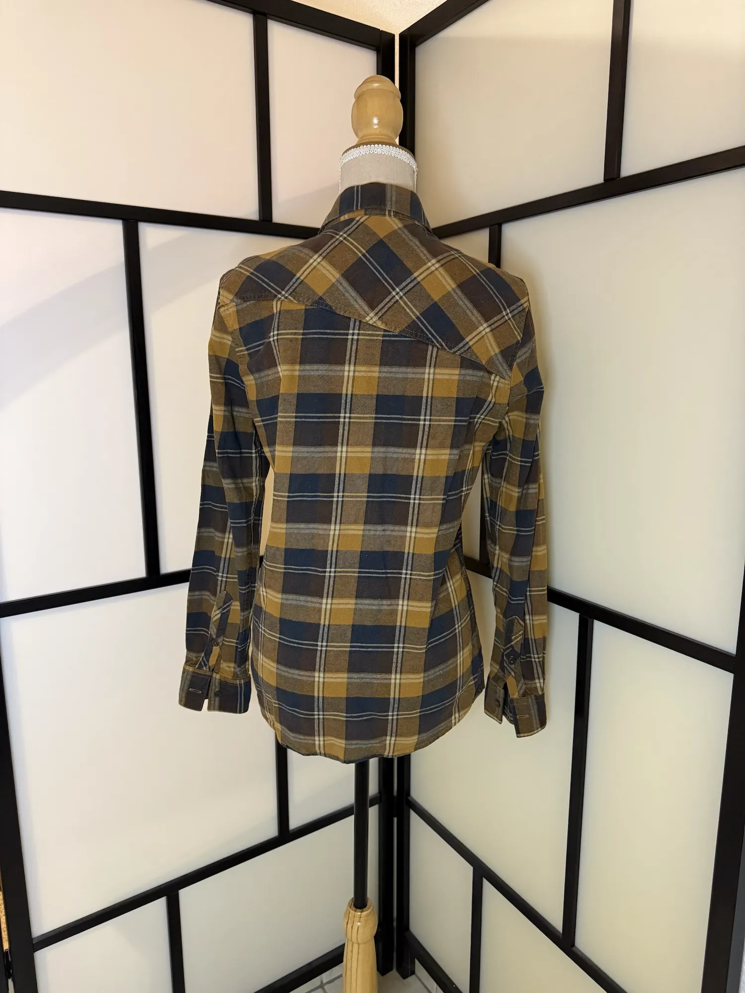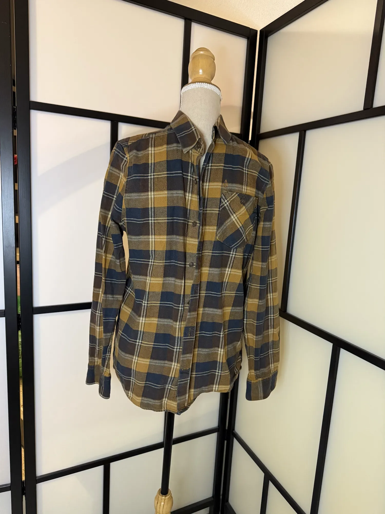Brown / mustard plaid shirt by Volcom in size S, worn condition.