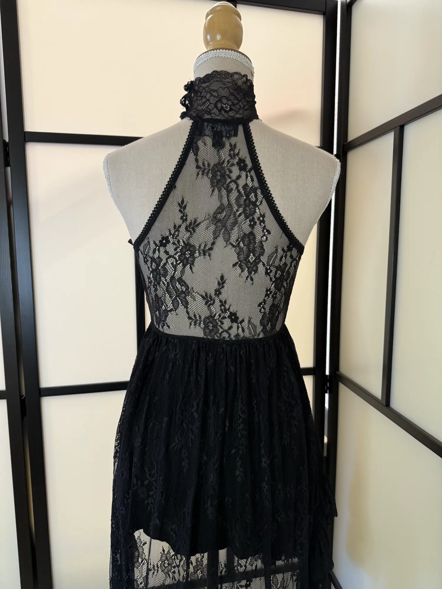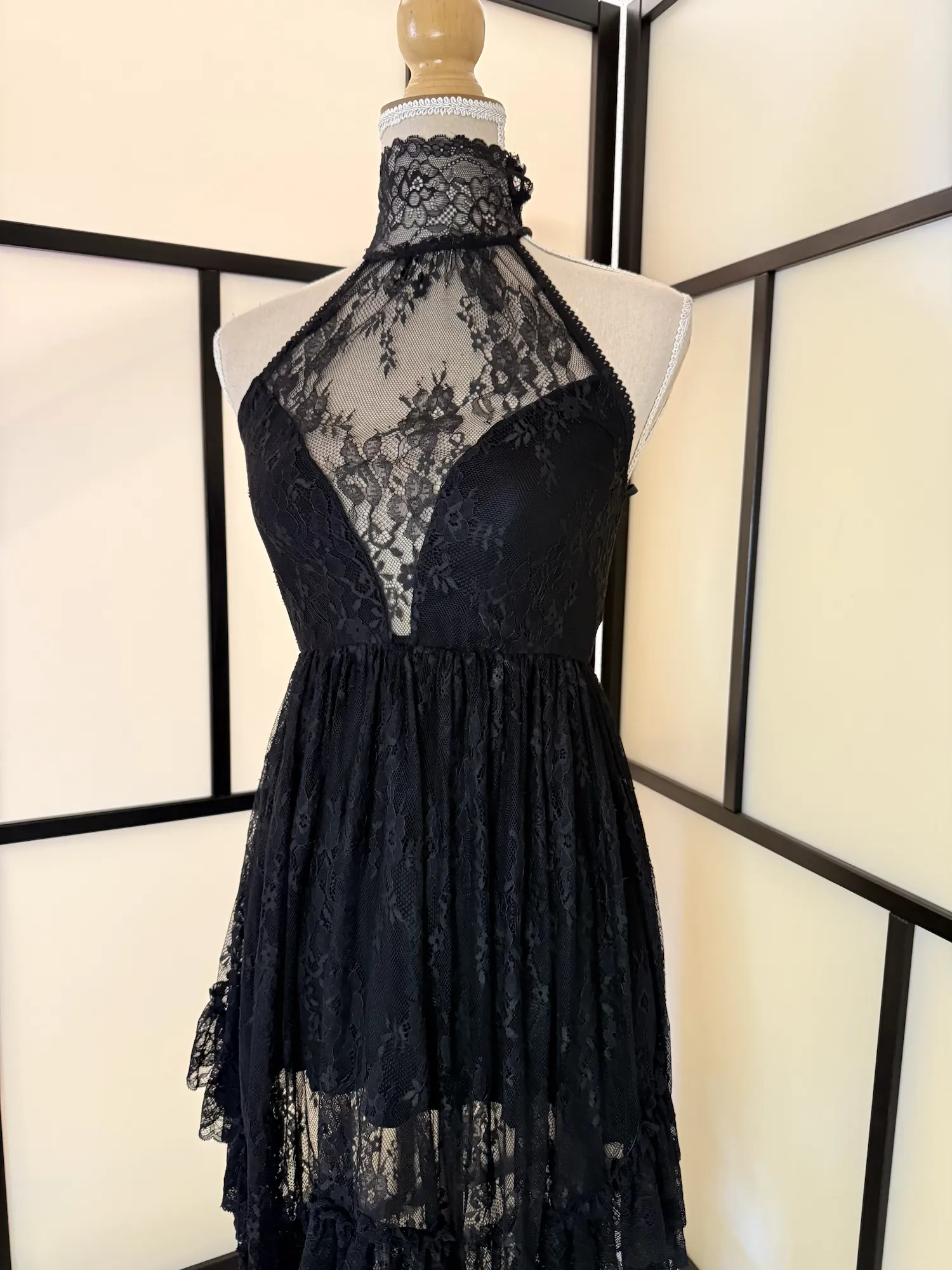 Stunning black lace halter dress by Widow featuring a sheer lace high neckline and detailed floral lace overlay. The bodice has a flattering fitted shape, while the flowy layered lace skirt adds soft, romantic movement.