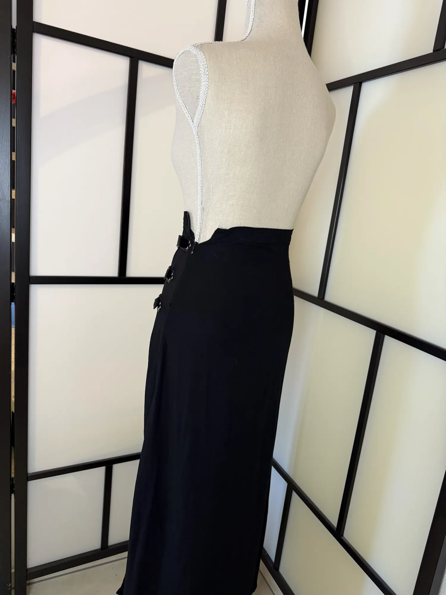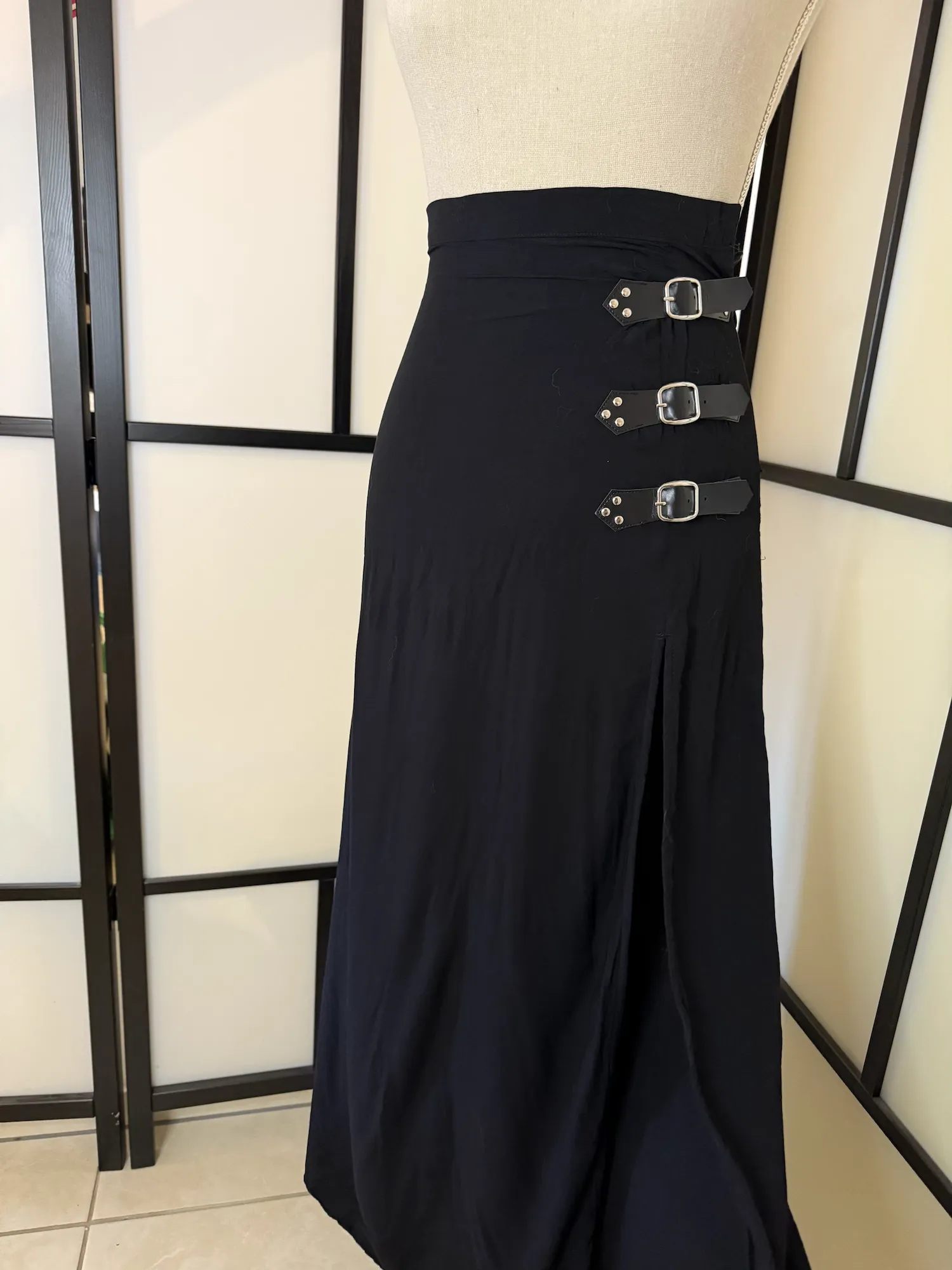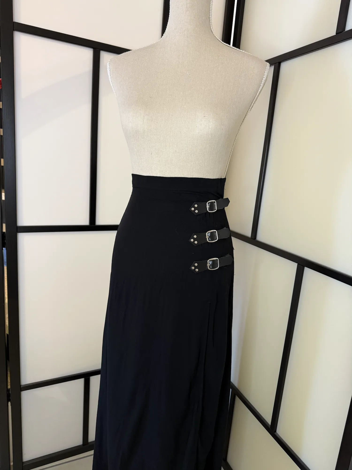 A sleek and striking black maxi skirt by Widow in size XXS. Designed with a high-waisted silhouette and three adjustable buckle strap details on the side, this piece blends gothic elegance with a bold, alternative edge.