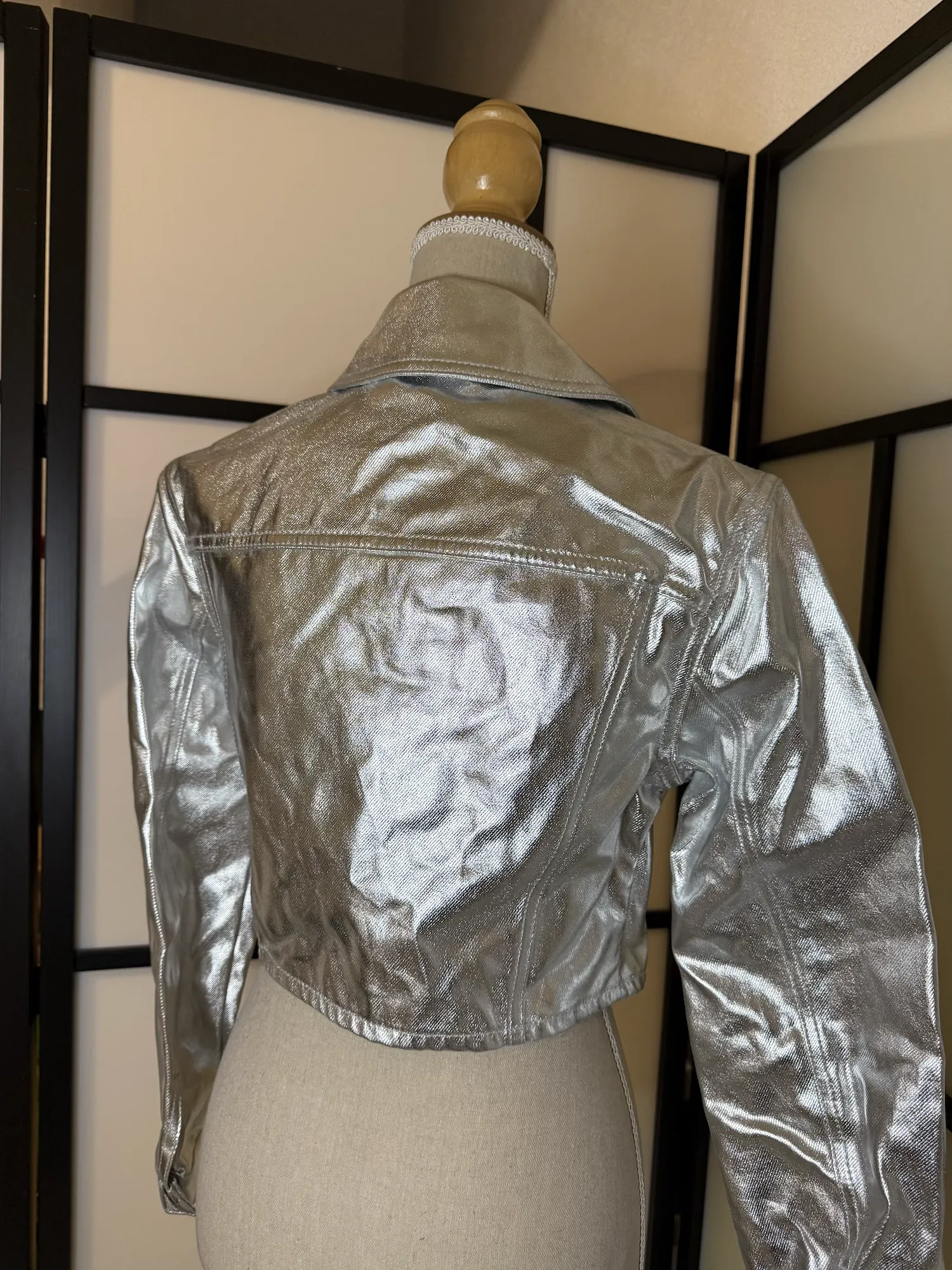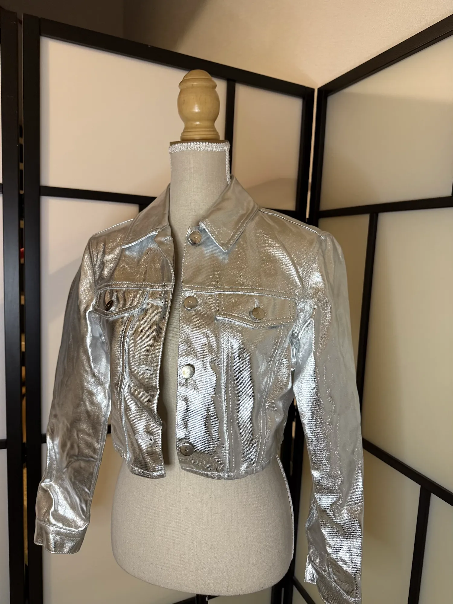 Designed in a structured denim-style silhouette with a glossy metallic finish that reflects beautifully in the light. The cropped cut gives it a flattering, modern shape, while the classic collar and button-front design keep it timeless with an edgy twist.